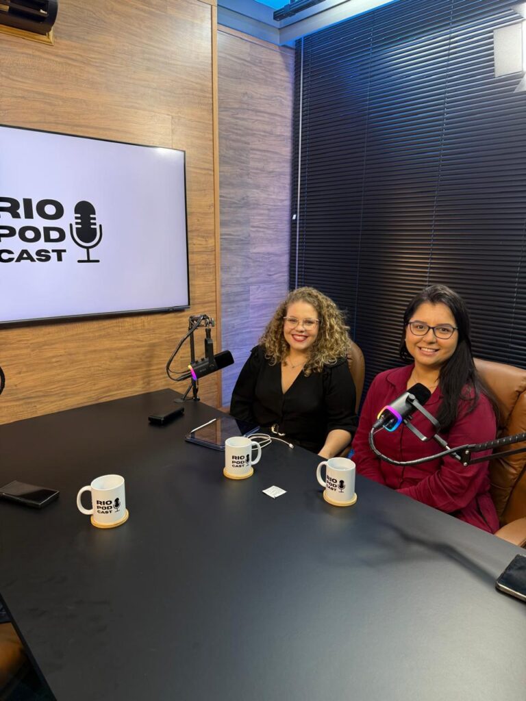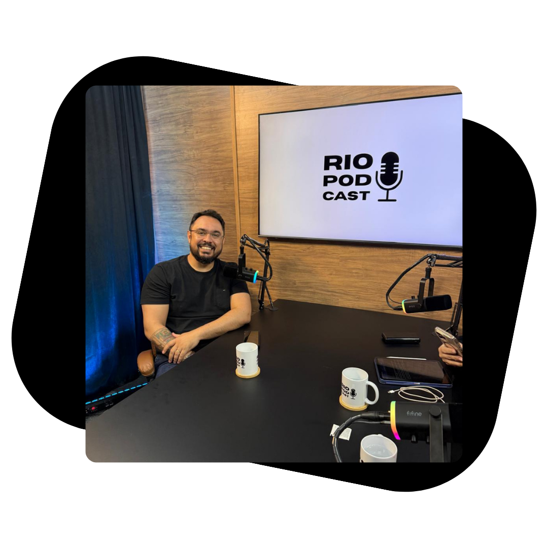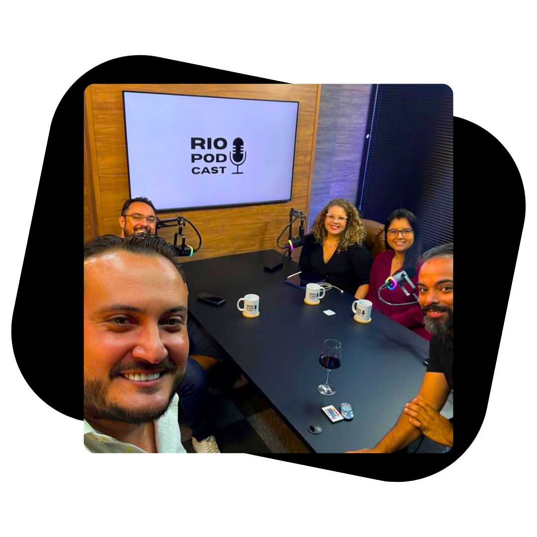 Produção completa de videocast com múltiplas câmeras, iluminação profissional e edição ao vivo